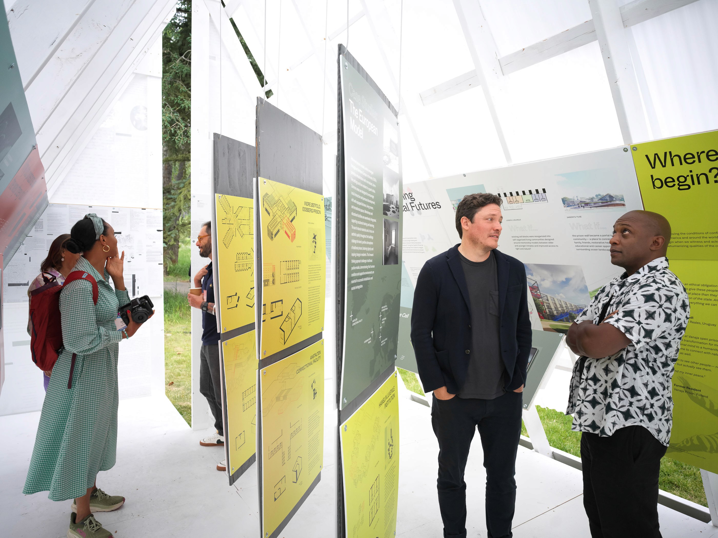 The pavilion was created to house the Conditions of Confinement exhibit, a centerpiece of the 2024 Aspen Ideas Festival. The primary goal was to design a structure that resonated with the vernacular of the Mountain West and Colorado, creating a sense of place while offering a space that was both welcoming and functional. It needed to attract passersby while protecting the exhibit’s sensitive graphics and video installations.