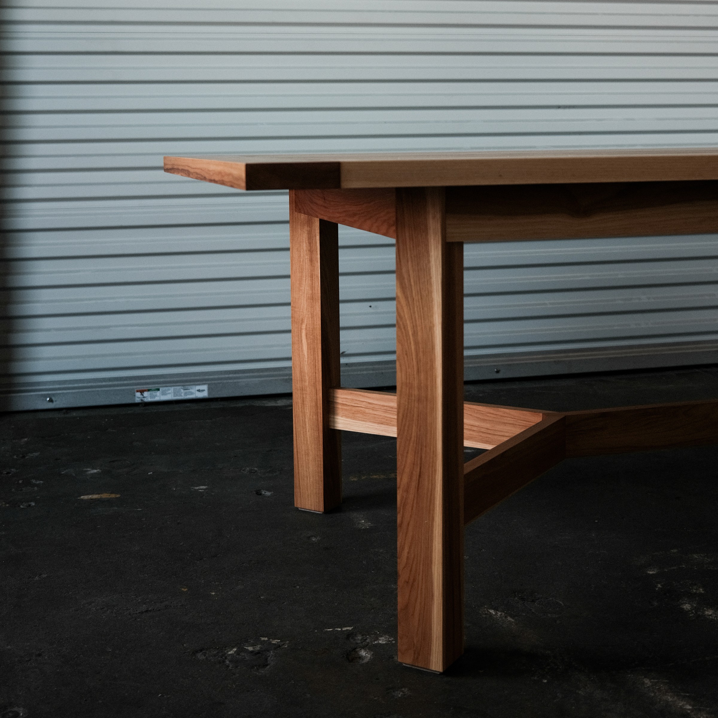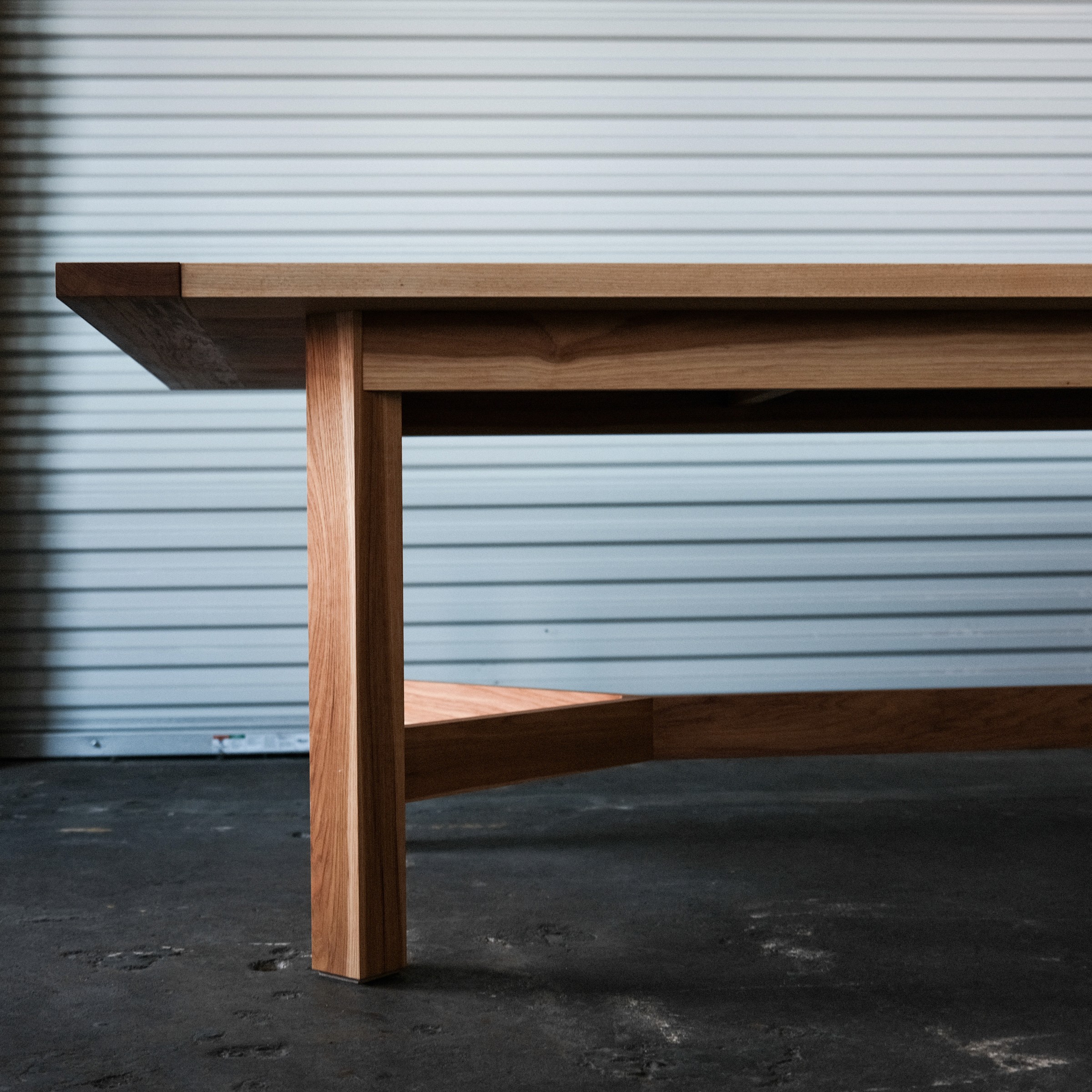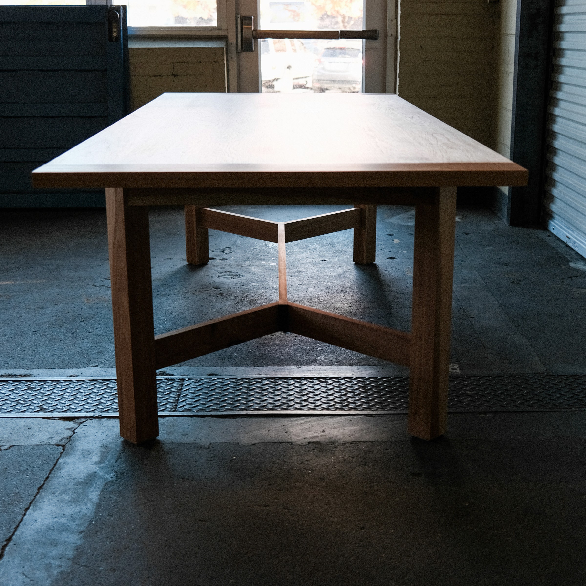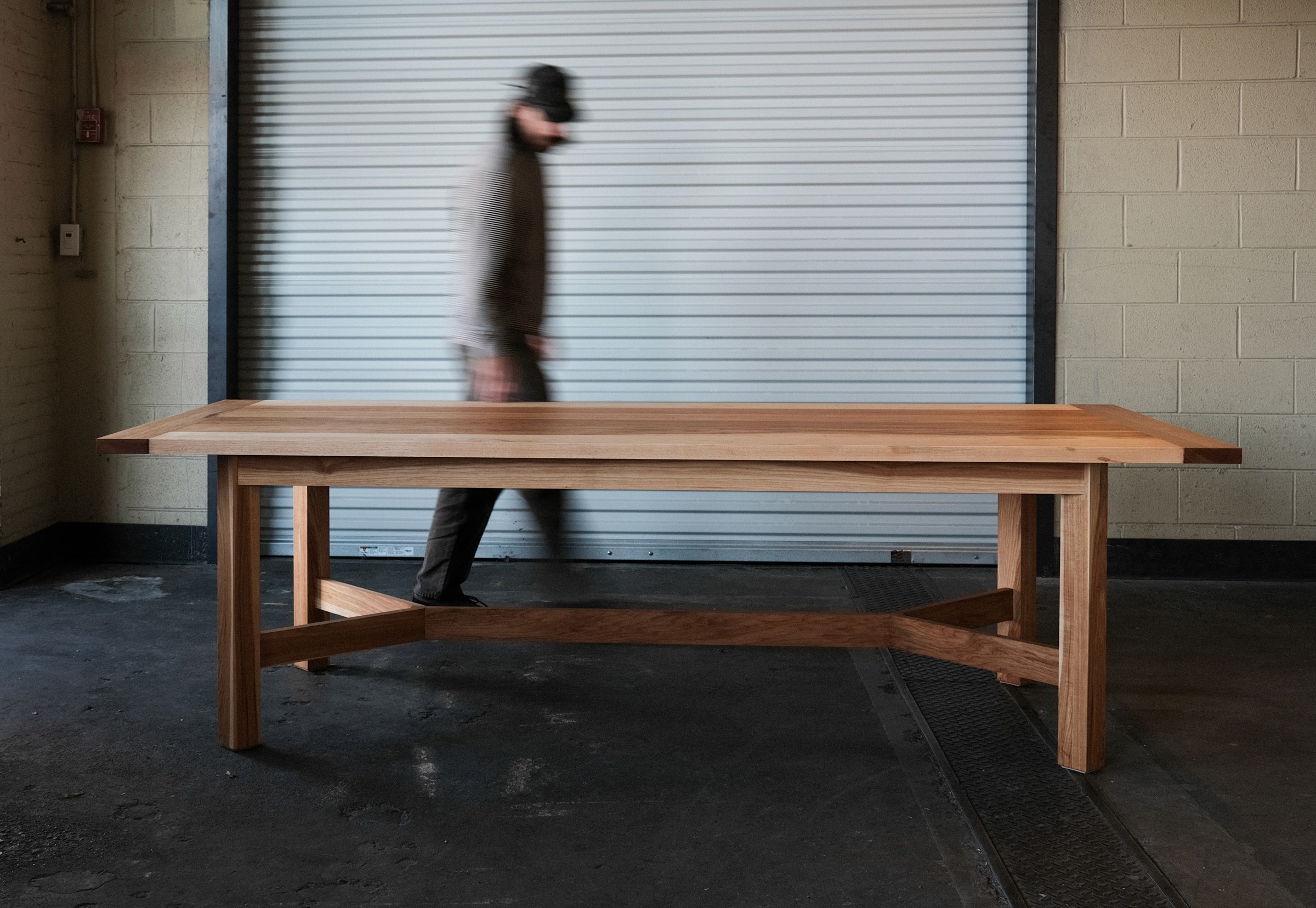 This custom dining table was designed for an arborist and his family, thoughtfully built to fit their space while comfortably seating six to eight people. We explored several wood options before settling on hickory for its strength and striking grain, which naturally contrasts between light sapwood and dark heartwood. The base features a double "Y" stretcher for structural integrity without compromising legroom. Designed with longevity in mind, the breadboards allow for seasonal movement, ensuring the table will endure for generations as a central gathering place.